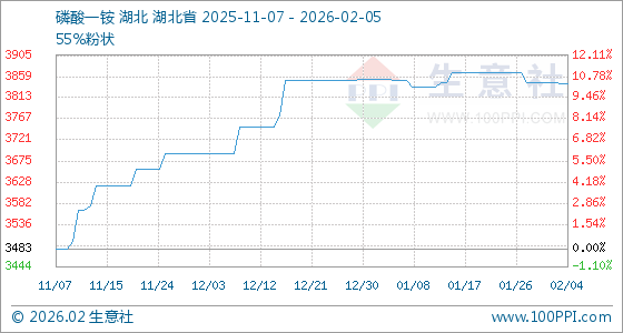 2月5日,生意社磷酸一銨基準價為3843.33元/噸,與本月初(3846.67元/噸)相比,下降了0.09%。